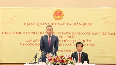 (VOVWORLD) - Dans le cadre de sa visite d’État en République de Corée, dimanche soir, le secrétaire général du Parti communiste vietnamien, Tô Lâm, a rencontré et pris la parole devant le personnel de l’ambassade et la communauté vietnamienne installée dans le pays.