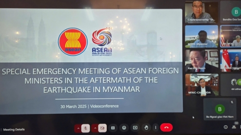 (VOVWORLD) - Ce dimanche matin, à la demande de la Malaisie, qui préside l’ASEAN en 2025, les ministres des Affaires étrangères du bloc ont tenu une réunion d’urgence en ligne pour discuter de la reconstruction après le séisme du 28 mars ayant frappé le Myanmar et la Thaïlande.
