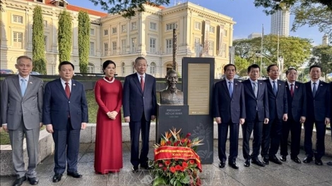 (VOVWORLD) - En visite officielle à Singapour du 11 au 13 mars, le secrétaire général du Parti communiste vietnamien, Tô Lâm, accompagné de son épouse, Ngô Phuong Ly, et d’une délégation de haut rang, a rendu hommage, mercredi, au Président Hô Chi Minh au Musée des civilisations asiatiques.