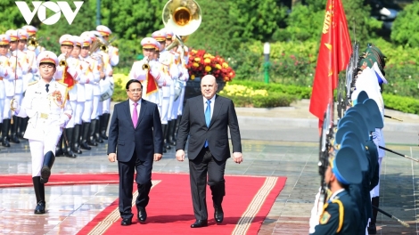 (VOVWORLD) - Ce mardi, le Premier ministre Pham Minh Chinh a accueilli au Palais présidentiel à Hanoï son homologue russe Mikhail Mishustin, venu pour une visite officielle de deux jours.