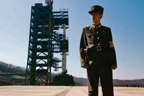 ![]() La fusée à longue portée Unha 3 sur son pas de tir sur le site de Sohae, en avril dernier. (Photo : David Guttenfelder/AP)