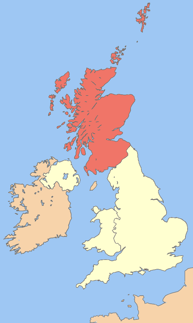 ![]() Emplacement de l'Écosse, en rouge, par rapport aux trois autres nations constitutives du Royaume-Uni, en jaune clair. Photo: Wikipedia