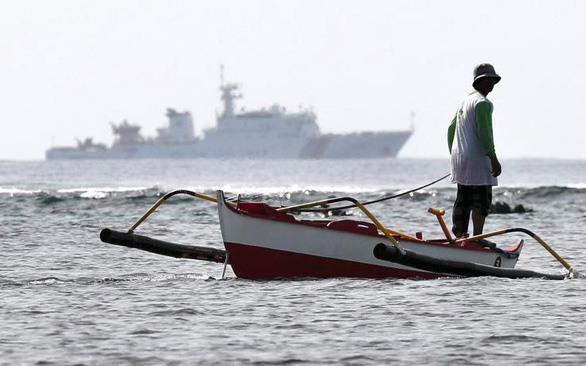 Un pêcheur philippin dans le récif de Scarborough, et plus loin un navire de garde-côtes chinois. Les pêcheurs philippins se plaignent constamment d’être inquiétés par des navires de garde-côtes et de pêche chinois depuis que Pékin en 2012 a de facto pris le contrôle de ce récif - Photo: AFP |