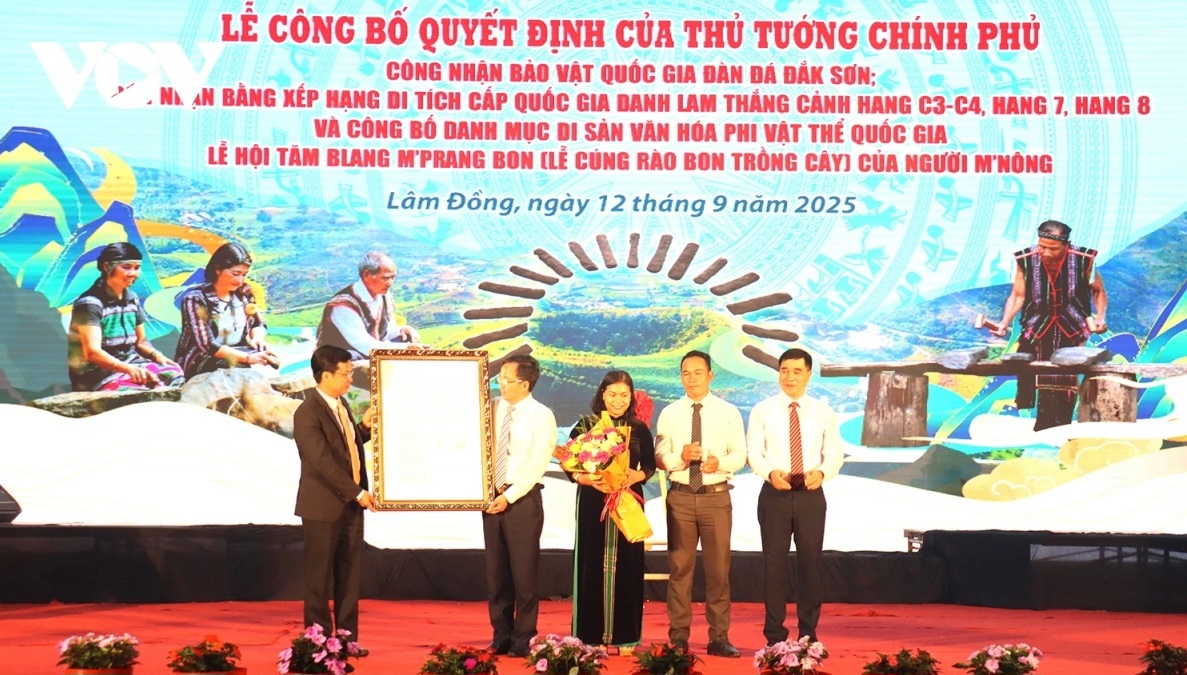 Les dirigeants de Lâm Dông reçoivent la Décision du Premier ministre reconnaissant le lithophone de Dak Son comme Trésor national. Photo: VOV |