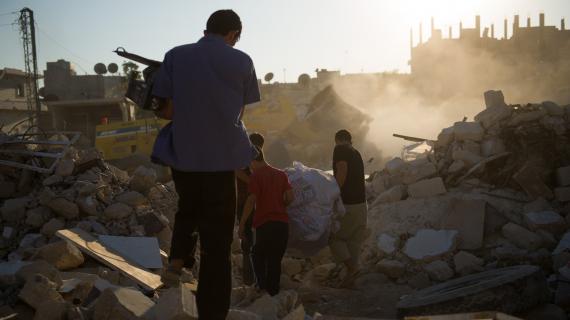 ![]() Des Syriens marchent sur les ruines de leur maison à Azaz, dans le nord du pays, le 19 août 2012 (photo : Phil Moore/AFP) |