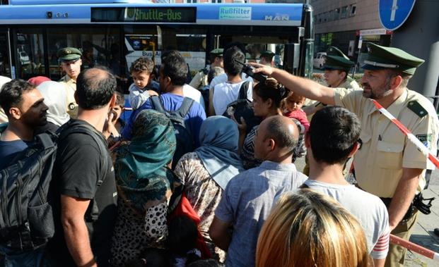 ![]() Des migrans en attente d'un bus à leur arrivée le 1er septembre 2015 à Munich. Photo : AFP/CHRISTOF STACHE |