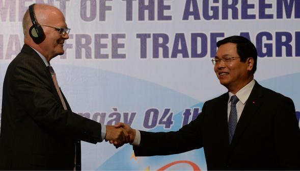 Les négociations sur l’accord de libre échange entre le Vietnam et l’Union européenne ont commencé le 26 juin 2012. Le ministre vietnamien de l’Industrie et du Commerce, Vu Huy Hoang et la commissaire européenne au Commerce, Cecilia Malmström, ont décidé que les réunions des 13 et 14 juillet dernier mettaient un terme final à leurs négociations. L’accord entrera en vigueur dès sa signature et à compter de cette date, 65% des marchandises vietnamiennes exportées en Union européenne seront exemptées de taxes. Le Vietnam et l’Union européenne annuleront la presque totalité des taxtes d’exportation ce qui permettra à chacune des parties de conquérir de nouveaux marchés. L’exonération de taxe sur la quasi totalité des produits est une des dispositions les plus favorables que le Vietnam ait obtenu dans un accord de libre échange. Le ministre vietnamien de l’Industrie et du Commerce Vu Huy Hoang : « La signature de cet accord permettra aux deux parties d’augmenter leur coopération dans le commerce, l’investissement et l’exportation. Les produits agricoles vietnamiens, notamment les fruits et légumes, les produits aquatiques et le riz, bénéficieront d’un dispositif très préférentiel. De leur côté, les exportateurs européens pourront facilement vendre au Vietnam leurs produits phares tels que le blé ou leurs fruits. »