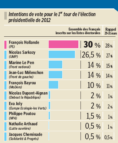 (*) Enquête réalisée auprès d'un échantillon de Français interrogés par téléphone ou recrutés par téléphone et interrogés par internet les 18 et 19 avril 2012. Echantillon de 2161 personnes inscrites sur les listes électorales et représentatif de la population française âgée de 18 ans et plus |