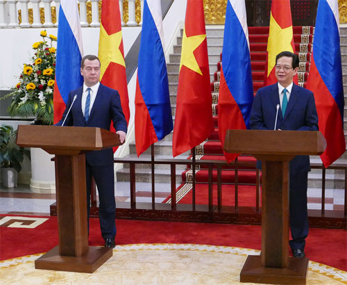 En 2014, la valeur du commerce bilatéral a avoisiné les 4 milliards de dollars contre 400 millions de dollars dans les années 1990. La Russie occupe la 17ème place parmi les 101 pays et territoires qui investissent au Vietnam. Majoritairement concentrés dans l’exploitation minière, l’industrie de transformation, la fabrication, le secteur bancaire et les télécommunications, 106 projets sont actuellement en cours, totalisant la somme de 2 milliards de dollars. A l’identique, le Vietnam a intensifié ses investissements en Russie. 19 projets sont en cours totalisant près de 2 milliards et demi de dollars. Fin 2014, le Vietnam a signé avec les pays membres de l’Union douanière Russie-Biélorussie-Kazakhstan, une déclaration commune visant à finaliser les négociations sur l’accord de libre échange en 2015. L’énergie est la filière la plus importante de la coopération russo-vietnamienne. Outre la co-entreprise Vietso-Pétro, les deux pays ont aussi crée Rusvietpetro, Vietgazprom et Gazpromviet afin d’élargir leur coopération pétrolière au Vietnam, en Russie et dans un pays tiers. Dmitri Medvedev:
