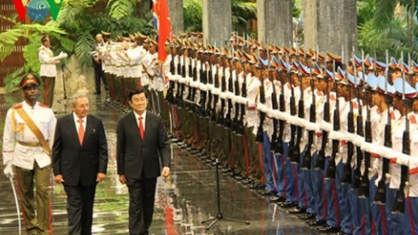 (VOVworld) - Le président de la République Truong Tan Sang a entamé lundi sa visite officielle à Cuba.Il entend approfondir la coopération intégrale et consolider la confiance entre les deux partis, les deux Etats et les deux peuples.