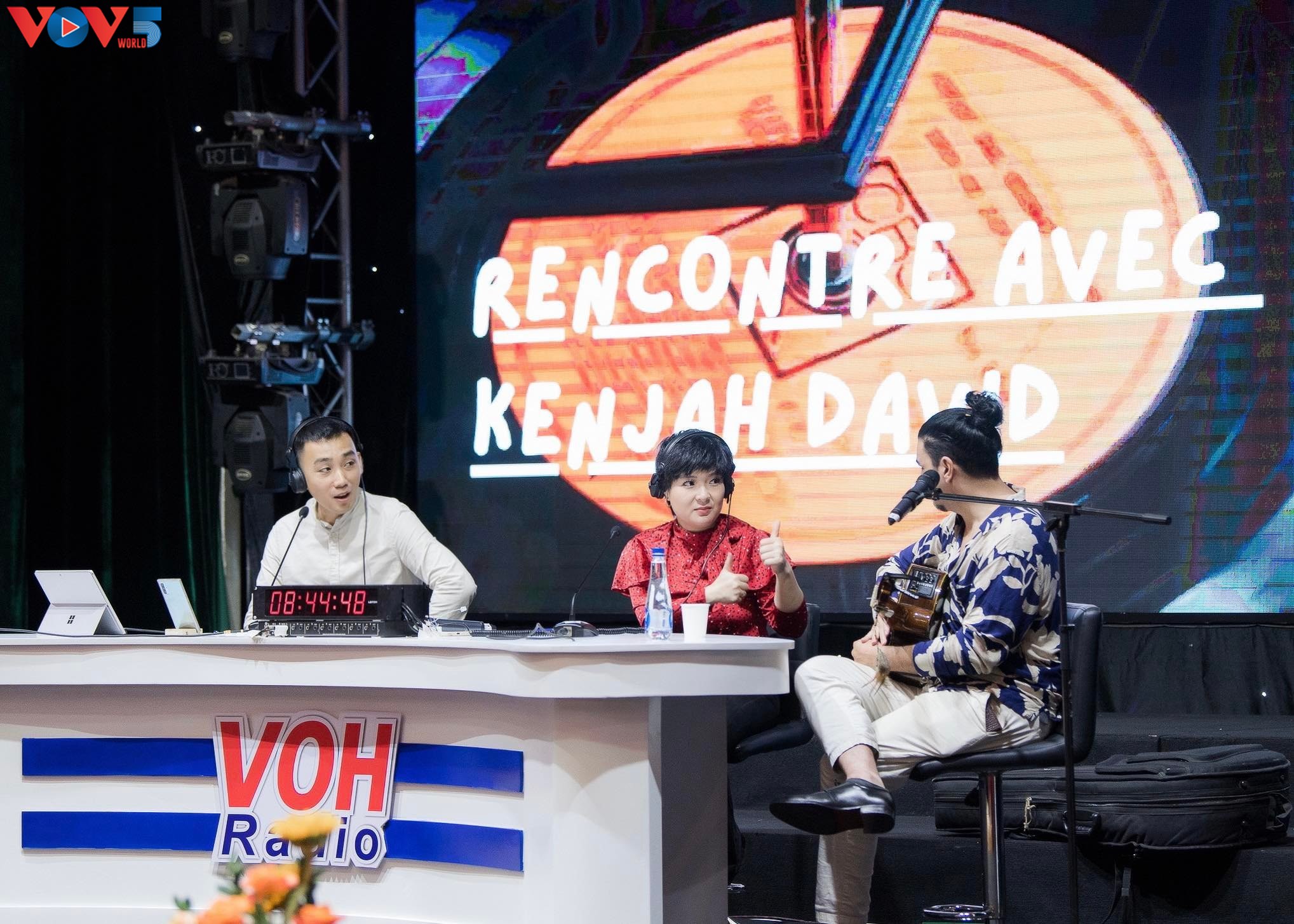 L’émission en français de la Voix du Vietnam lors du 15e festival national radiophonique et l’invité spécial Kenjah David (droite). |