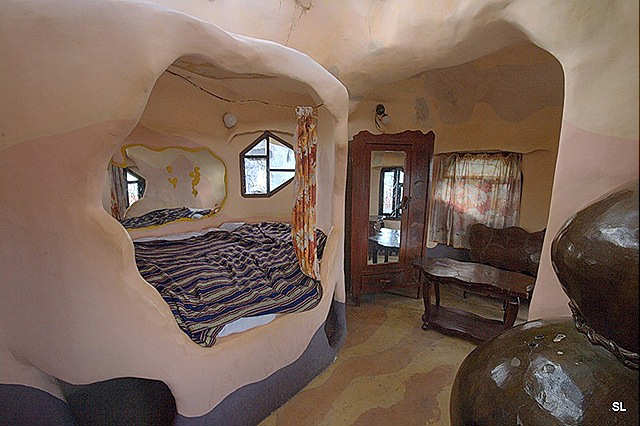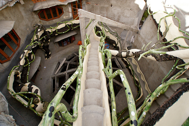 Toute la maison est un pays imaginaire. Cette édifice totalement hors norme est un mélange burlesque d'Alice au Pays des Merveilles et de Gaudi, un labyrinthe avec des escaliers en colimaçon, des tourelles et des arbres artificiels.