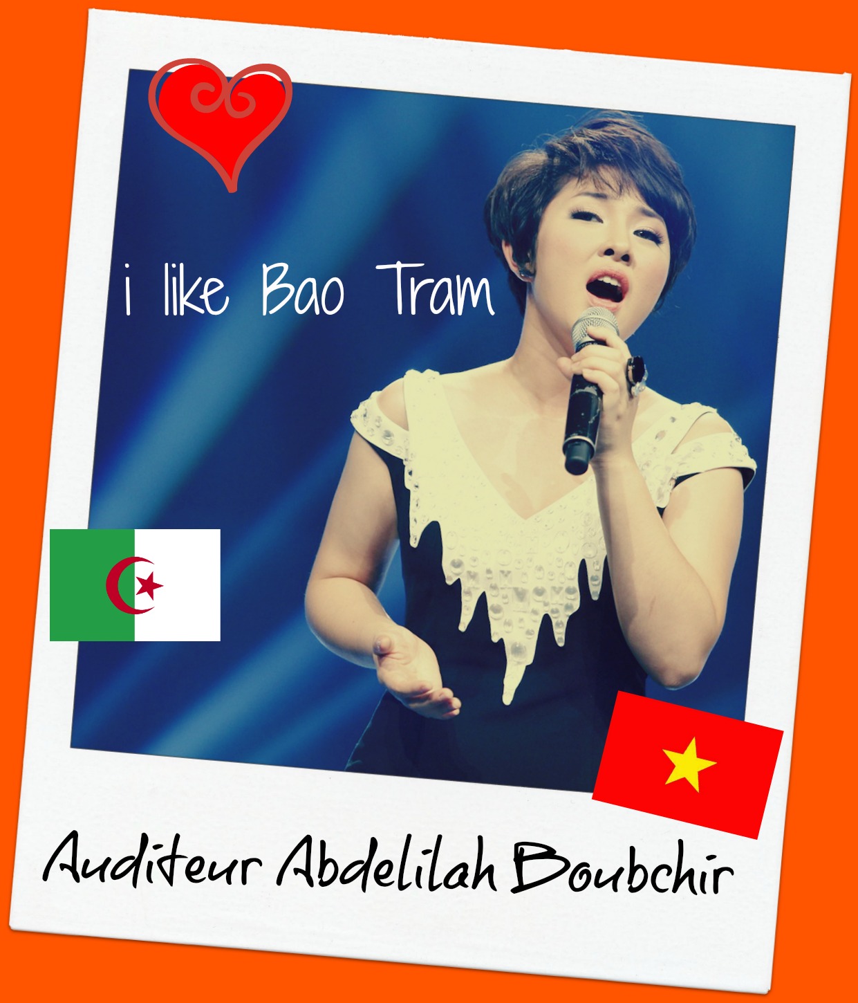 De l’Algérie, Abdelillah Boubchir nous a exprimé son admiration pour Bao Trâm, une jeune chanteuse vietnamienne. Cher ami, vous pouvez écouter gratuitement plusieurs de ses tubes sur Internet.