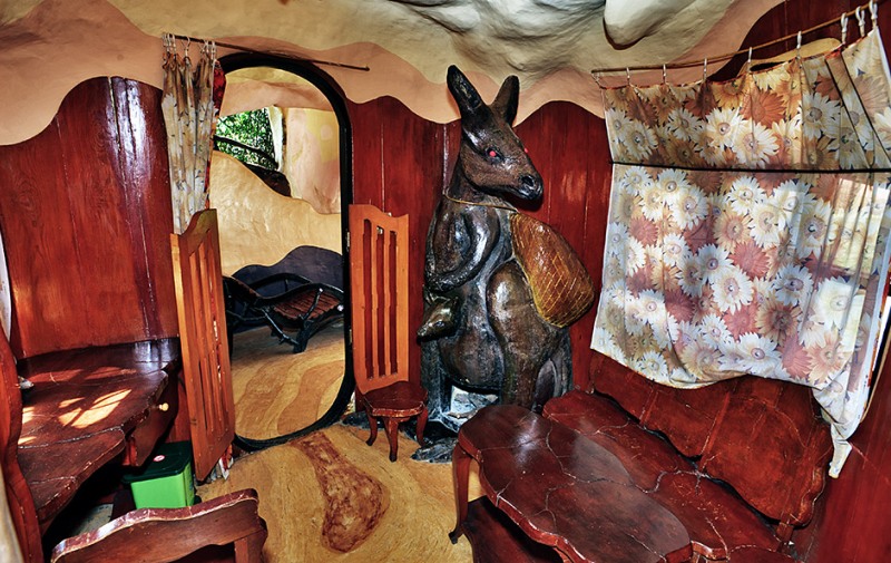 Dans la salle Kangourou, vous dormirez à côté de la sculpture d’un kangourou surdimensionné avec des lumières dans ses yeux rouges, et une cheminée dans sa poche.