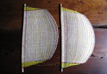 Les premiers éventails étaient rigides. Par la suite les montures commenceront à être en bambou. A l’origine, on tressait des éventails de forme hémisphérique avec des fibres de rotin finement fendus. Dans les régions méridionales, plusieurs autres matières végétales locales étaient utilisées : spathe d’aréquier, feuille de palmier ou de bananier, entre autres.