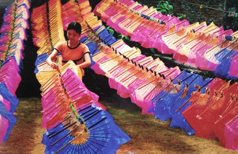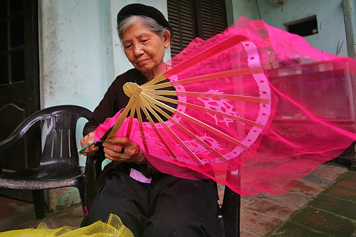 Savez-vous que l’éventail donne aussi son nom à une rue du vieux quartier de Hanoï ? « Hang Quat » ou la rue des éventails, en français, proposait autrefois divers types d'éventails en provenance des villages de Kim Lu, Canh Hoach, Ve, Vo et Do Dinh, situés dans la banlieue de Hanoi. Les produits du village de Kim Lu étaient appelés éventails Lu. Ils étaient en papier ou en gaze, avec des montures en bambou voire même en ivoire. Les éventails Vac du village de Canh Hoach se caractérisaient par des feuilles ajourées qui laissaient entrevoir la lumière. Le village de Ve fabriquait des éventails en bambou tressé de diverses formes avec des feuilles de figuier ou de trapèze, le village de Do Dinh, proposait quant à lui des éventails en plumes etc celui de Vo, lui, était connu pour ses grands éventails carrés.