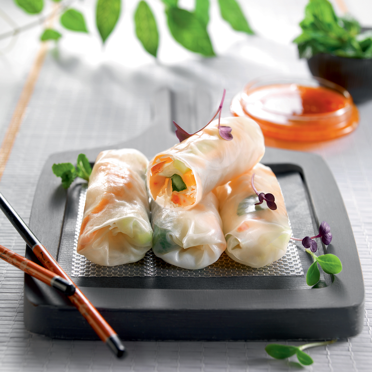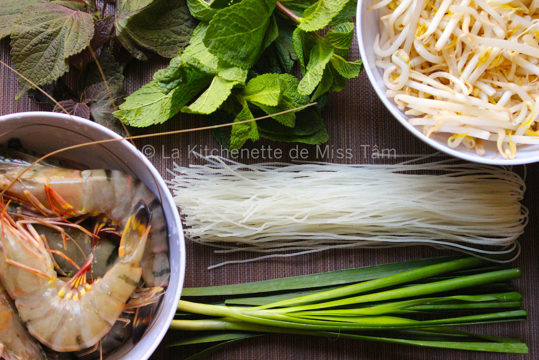 Voici ma recette préférée, celle au poulet avec ce dernier ingrédient, de la pure gourmandise ! En pratique, on utilise des feuilles de riz déjà préparées et séchées, qu’on trouve dans toutes les bonnes épiceries exotiques ou dans votre supermarché préféré. Pour quatre personnes, il faut compter une douzaine de galettes de riz et autant de crevettes de taille moyenne, 300 grammes de filets de poulet, deux œufs, un bouquet de menthe, quatre brins de ciboulette chinoise (à tiges plates), 100 grammes de germes de soja, un morceau de gingembre, des herbes aromatiques comme le coriandre, de la laitue, un concombre, et une carotte.