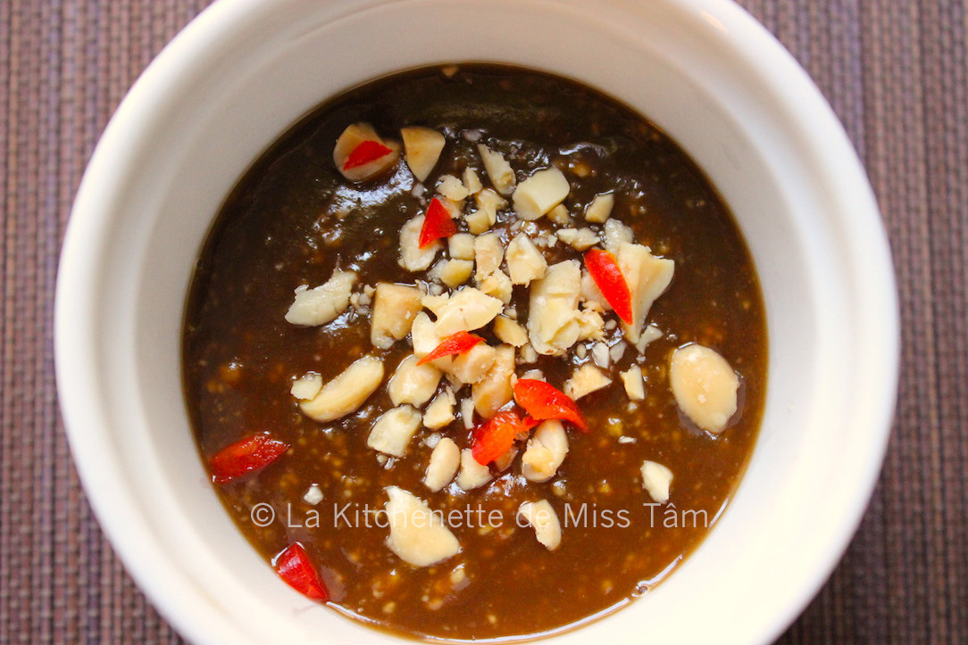 Pour la sauce où l’on trempera le rouleau pour lui donner plus de saveur, verser dans de l’eau deux cuillères de cacahuètes grillées et pilées, une gousse d’ail, un piment rouge, du sucre, du poivre, ainsi que trois cuillères à soupe de sauce Hoï Sin (ou «hoisin») vendue en bocal.