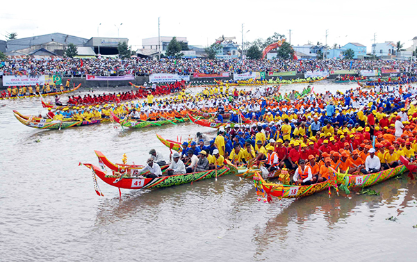 Le lendemain a lieu une course de pirogue traditionnelle. Le jour J, la foule se rassemble aux bords du fleuve Mékong pour encourager les équipes de rameurs, au son des tambours et des gongs, dans une ambiance très festive. Vers midi, lorsque la marée atteint son pic, le bord du fleuve est en effervescence. A l'arrivée de la course, l’équipe gagnante et sa pirogue sont suivies par les spectateurs le long du fleuve aux sons des tambours et des gongs.