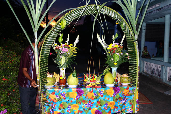 Tous les Khmers de la région célèbrent l’évènement soit chez eux, soit dans les pagodes. Les gens érigent des poteaux de bambou avec une barre transversale qu'ils décorent avec des fleurs et des feuillages. En dessous, ils placent une table d'offrandes sur laquelle on met des flocons de riz, des pommes de terre, des bananes, des noix de coco, des pamplemousses, des oranges et des gâteaux.