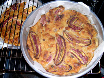 L’ultime critère de réussite de ce gâteau à la banane est l’obtention « magique » de la coloration, entre mauve rosée et violet, de la banane. Rien de magique bien sûr, il s’agit simplement d’une cuisson lente, très lente meme, à basse température. En moins d’une heure de cuisson, il est rare d’avoir cette belle coloration naturelle.