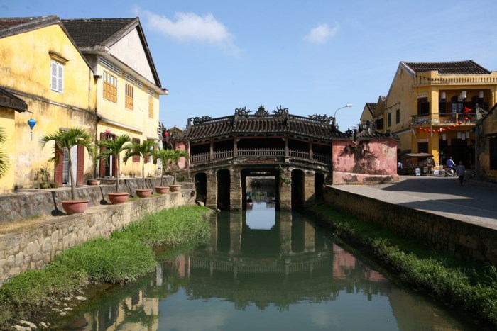 -Pont japonais (Chua Cau: Pagode-pont): au bout de la rue Tran Phu, le seul ouvrage architectural de ce type qui reste à Hoi An, construit à la fin du 16e siècle par les commerçants japonais. Un toit en vielle tuile couvre le pont et le pagodon, tous deux en bois couvert de peinture rouge et finement gravé. À chaque extrémité du pont se trouve un couple de singes et de chiens, des animaux sacrés pour les Japonais. L’ouvrage a été restauré plusieurs fois (en 1763, 1817, 1865, 1915 et 1986).