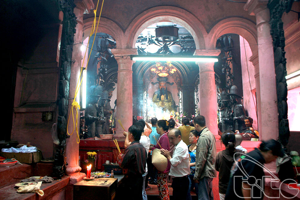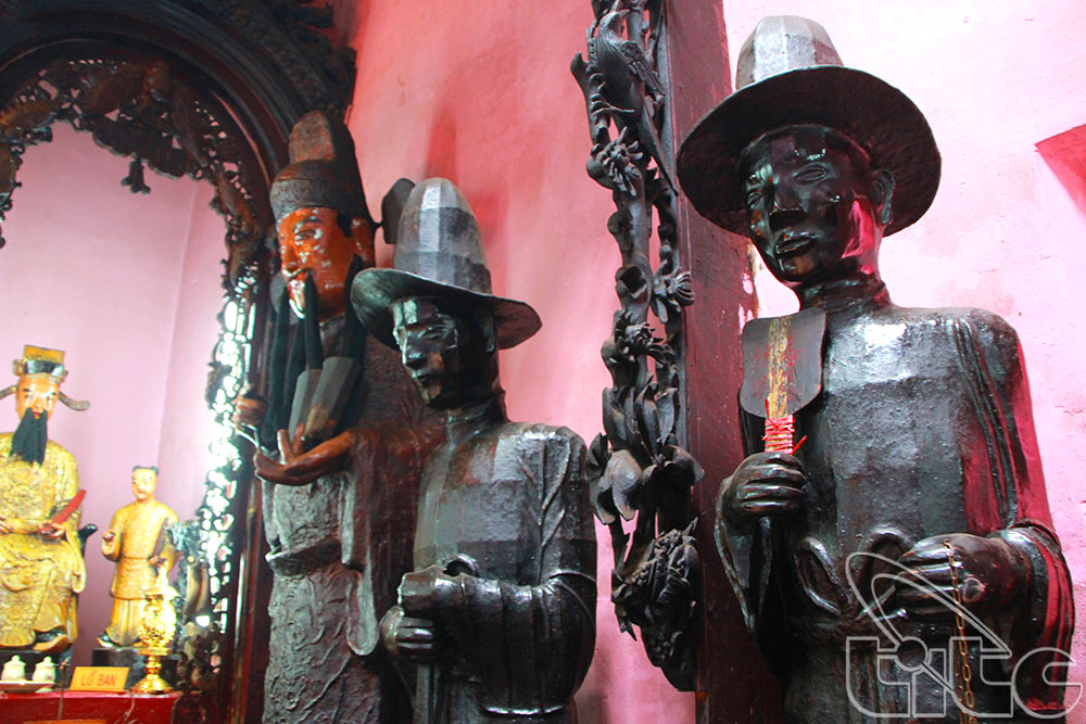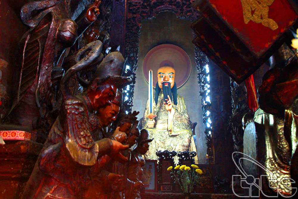 Après avoir admiré le toit et son fronton, on pénètre dans le sanctuaire pour découvrir deux immenses statues terrassant l’une le dragon vert et l’autre le tigre blanc. Sur l’autel central, l’Empereur de Jade est accompagné des ses gardiens, les quatre grands diamants, cœurs purs et être invincibles. Avec ça votre imaginaire n’est pas au bout des ses surprises, puisqu’immédiatement, à gauche de l’autel, on pénètre dans la salle des enfers où l’on trouve le maître de ces derniers et son cheval rouge ainsi que toutes les divinités chargées de punir et de récompenser aussi parfois, punitions dont le détail est expliqué sur les panneaux de bois de la salle des dix régions des enfers.