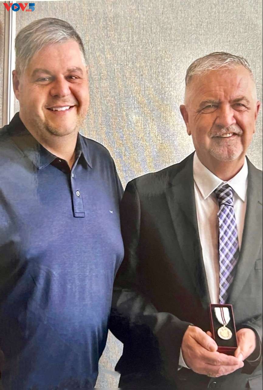 Roger R. Roussel (droite) et sa médaille du jubilé de platine de la reine Elizabeth II
