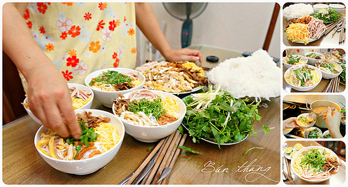 Que signifie bun thang, donc ? Les bun sont des vermicelles de riz et thang, originaire de l’ancien sino-vietnamien, signifie le bouillon. Littéralement, vermicelles de riz au bouillon… Cela montre bien toute l’importance du bouillon dans ce met. Ce plat complet est à base de bouillon de poulet, de coriandre vietnamienne, de pâté de porc, d’une fine omelette, de navets marinés, de champignons parfumés, de crevettes, de vermicelles de riz. En réalité, il n’y a pas moins de vingt ingrédients différents. Les critères de qualité de ce plat se mesurent à la saveur et à la limpidité de son bouillon, à la préparation minutieuse de chaque garniture, et à la présentation du plat en forme de fleurs à cinq couleurs.