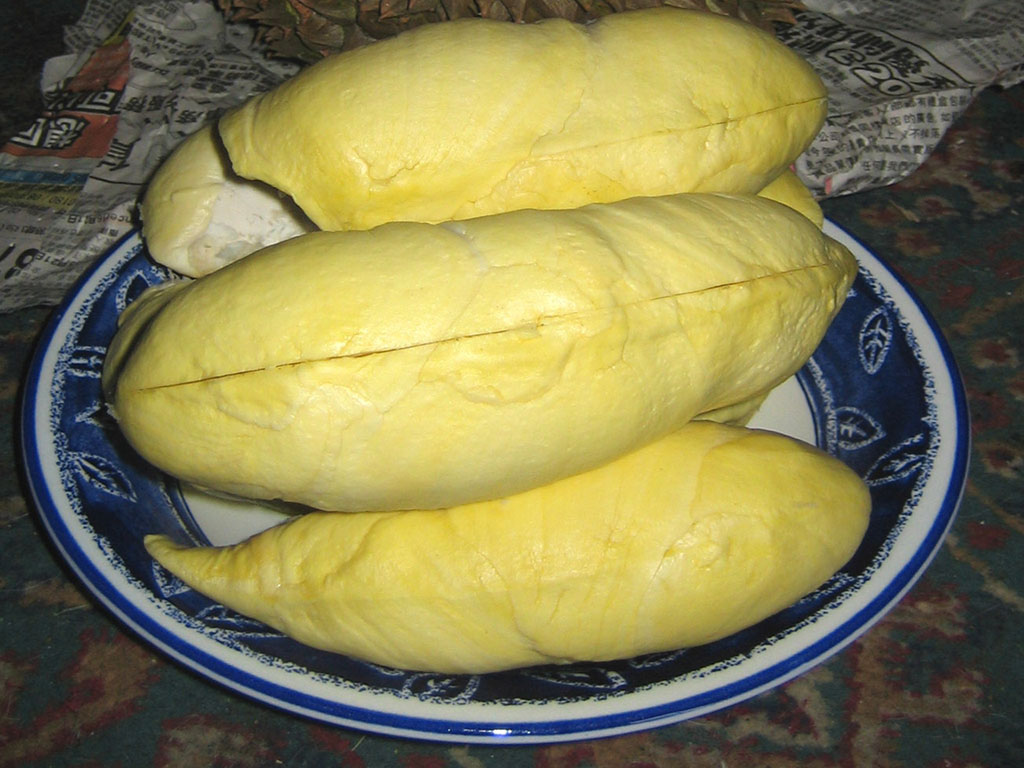 Pour ceux qui ne connaissent pas le durian, laissez-moi vous expliquer en quelques mots de quoi il s’agit. C’est un énorme fruit de forme ovale entouré d’une écorce à piques, les vendeurs d’ailleurs le prennent avec des gants. Ce fruit a la particularité peu commune…. De puer. La partie qui se mange est à l’intérieur. Normalement, on vous découpe le fruit sous les yeux et on vous extrait la partie mangeable dans une barquette en plastique. A tous visiteur venu d’autres horizons…. Evoquer le durian, c’est l’assurance au mieux d’une grimace en retour, au pire de quelques qualificatifs peu répétables ! Et c’est vrai qu’à une centaine de mètres à la ronde…. L’odeur soulève le cœur.