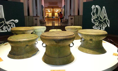Réalisés en bronze avec un moule à section pour certains ou à la technique à la cire perdue pour d’autres, ces tambours sont présents dans les tombes des personnages de haut rang. Egalement connus sous l’appellation « tambour de pluie », ils semblent avoir un rôle étendu, non seulement dans certains cultes de fécondité, mais peut-être aussi dans la plupart des rites communautaires et claniques.