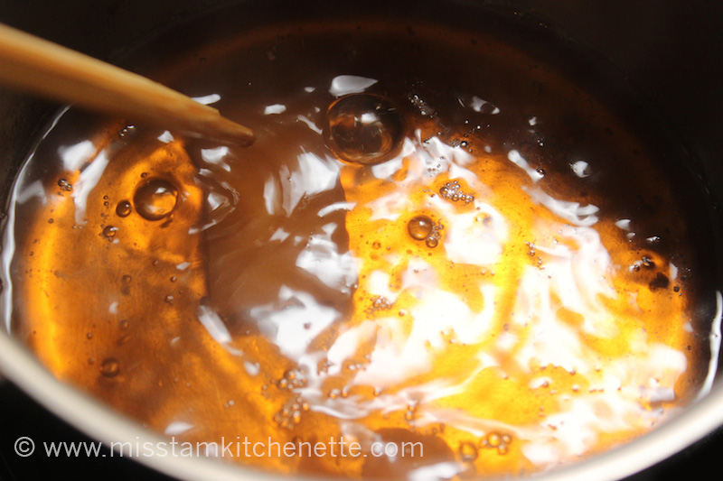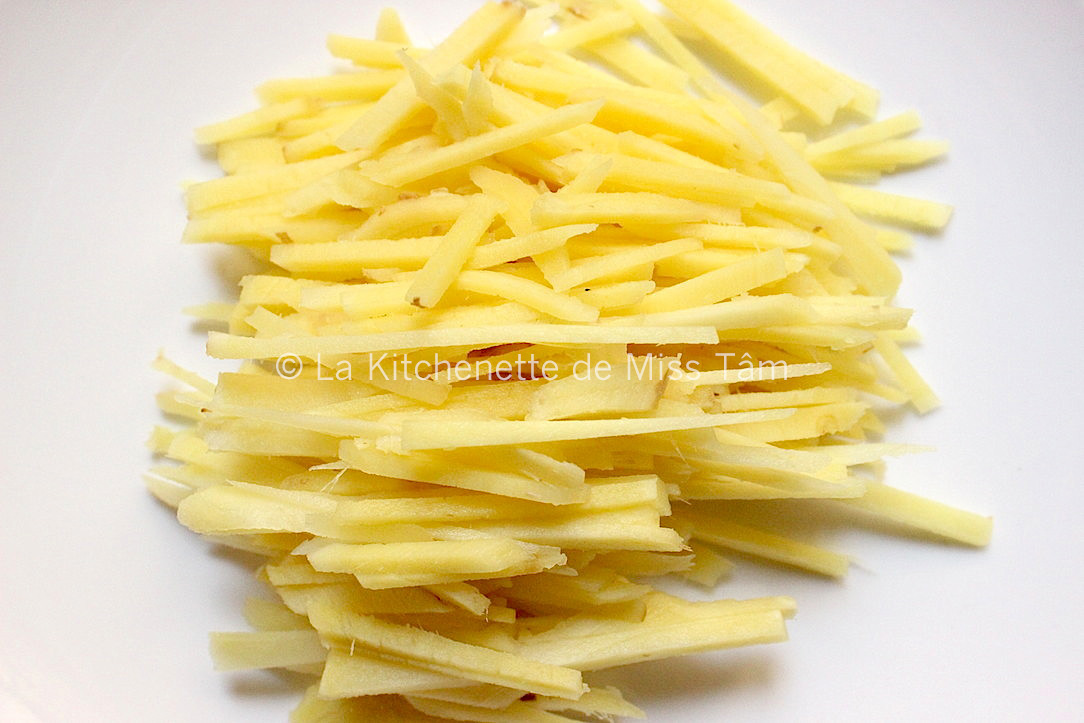 Allez, on attaque d’abord le sirop ! Faites bouillir du sucre et de l’eau dans une casserole. Ajoutez le gingembre coupé en julienne. Continuez à feu doux pendant un quart d’heure.