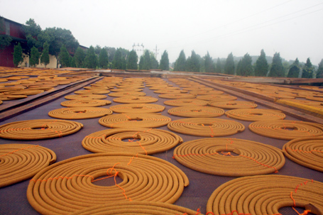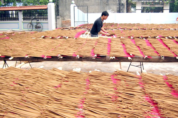 Le bâtonnet, en bambou, est enrobé d’une pâte à base de cette résine et de sciure de bois. Le plus surprenant, c’est que cette opération est réalisée manuellement, tige par tige, par des personnes à la dextérité exceptionnelle. D’abord fendre des bâtonnets d’une trentaine de centimètres de long qui seront teintés de rouge une extrémité. Séchées sur des tréteaux, ces tiges sont ensuite emballées dans du papier, rouge naturellement.