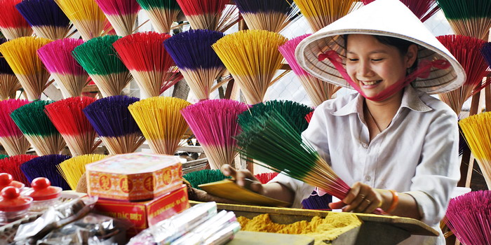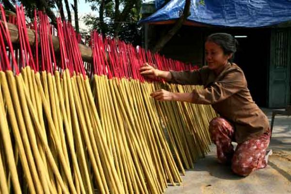 Le plus spectaculaire ornement des temples et des pagodes au Vietnam sont d'énormes spirales d'encens suspendues au plafond. Elles sont allumées surtout à l'époque du Nouvel An lunaire et se consument très lentement pendant toute la durée de la fête. Allumer un bâton d'encens est le premier geste rituel de tous les cultes, le parfum est destiné à attirer l'attention du dieu ou de l'esprit dont on sollicite l'appui. Mais son utilisation ne se limite pas au temple. De même pour le culte des ancêtres, dans chaque maison, quelques bâtonnets, jamais moins de trois, se brûlent devant la photo d'un parent, ou dans la cuisine, en l'honneur du dieu du foyer. Il s'en consomme donc beaucoup. Il existe d'innombrables fabriques.