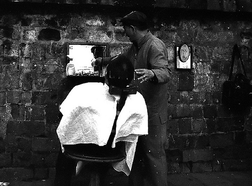 En effet, la coiffure sur trottoir est exclusivement réservée à la chevelure masculine : on est là pour couper, égaliser, tondre, élaguer, raser, pas pour frictionner, masser, peigner, colorer… C’est du sérieux, de l’ouvrage efficace ! Le coiffeur est un combattant qui, armé de son rasoir et de ses ciseaux, fait la guerre au poil égaré, au cheveu trop grand, à l’épi rebelle. Il discipline, remet dans les rangs, tout le monde au garde à vous ! Et si les tiffe protestent, le coiffeur les éliminera purement et simplement. Ici, pas de quartier, le beau, c’est le net, le « sans bavure », la ligne droite ! Pour autant, dans cette ambiance quasi-militaire, si on se fait raser, on ne se rase pas…
