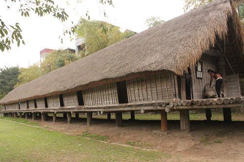 Les murs et le plancher de la maison sur pilotis sont en bois ou en bambou, le toit est en chaume. Elle est divisée en trois compartiments ; celui au milieu est réservé au culte des ancêtres, les deux autres servent de chambre à coucher aux garçons et aux filles.