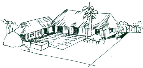 Ces maisons forment un cercle autour de la maison communale, laquelle est située sur un espace élevé au centre du village. Elles sont souvent divisées en deux ou trois compartiments: cuisine, salle à séjour et chambre à coucher.