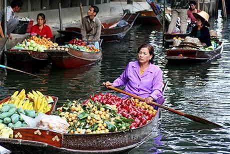 Pendant les premières heures du marché du matin, au milieu du mouillage des grands bateaux se créent des voies réservées aux petits bateaux. La voie d'eau devient un labyrinthe de centaines de bateaux transportant les fruits ou les légumes. Les barques qui vendent de la bière, du vin et des boissons vont vers les bateaux pour servir les marchands et visiteurs. Les vendeurs exposent leurs produits à un grand poteau de façon à ce que les acheteurs puissent voir de loin ce qu'ils vendent.