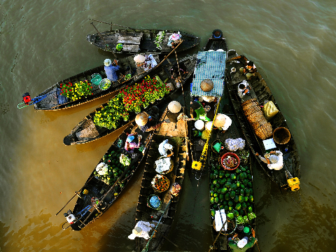 Cette scène d’échanges commerciaux pleine de vie est typique du delta du Mékong. Il est très agréable d’y prendre part et d’être témoin de ce mode de vie ancestral. Les barques des familles de commerçants jettent l’ancre près du rivage. Ce sont comme des appartements mobiles, sur l’eau, dotés de tous les conforts de l’autel des ancêtres au poste de télévision en passant par la chaîne hi-fi ou la moto...