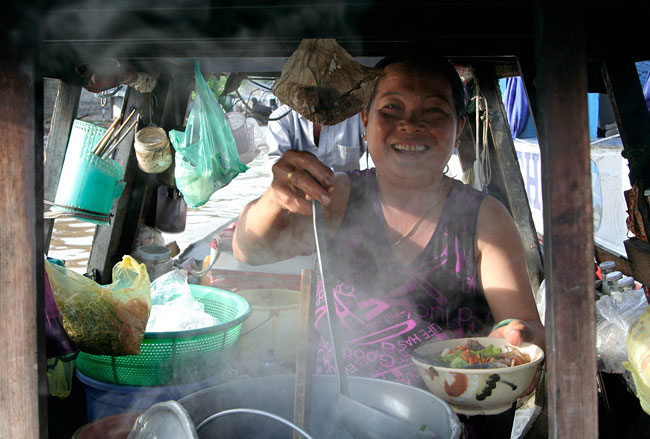 Les barques proposant casse-croûtes et boissons vont ici et là pour servir leurs clients. Un bol de soupes hu tieu - une spécialité du Sud, coûte 8.000 dongs et on prend un verre de café pour 3.000 dongs. Des apéritifs sont proposés pour accompagner l’alcool. En bref, hommes, femmes, enfants : personne ne repart le ventre vide. Il y a d’ailleurs plein d’autres choses sur ce marché à part. On trouve forcément son bonheur que l’on cherche un moteur, une balance, de l’essence, des bouteilles de nuoc mam, du sel, des médicaments ou des bonbons...