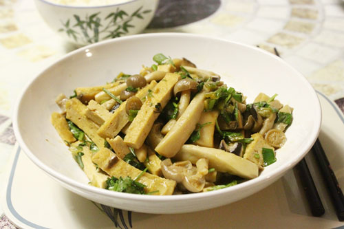 Le tofu aux champignons est un plat facile à faire, mais tout à fait délicieux. Côté ingrédient, il nous faut 200 grammes de tofu moelleux, 100 grammes de champignon blanc, de la sauce de poisson, du sel, du sucre, du poivre, de la ciboulette séchée ou fraîche et de la coriandre finement coupées. On faire frire le tofu puis le couper en lanières fines. Ensuite, on lave les champignons et laisse les égoutter. A feu moyen-vif, on fait chauffer deux cuillères à thé d’huile, fait revenir la ciboulette séchée, y ajoute les lanières de tofu, mélange le tout et laisse cuire pendant environ 5 minutes. Puis, on augmente l’intensité du feu (feu vif) et ajoute les champignons, une cuillère à soupe de la sauce du poisson, une demi cuillère à thé de sucre, mélange bien les ingrédients jusqu’à ce qu’ils soient amalgamés au tofu et aux champignons.