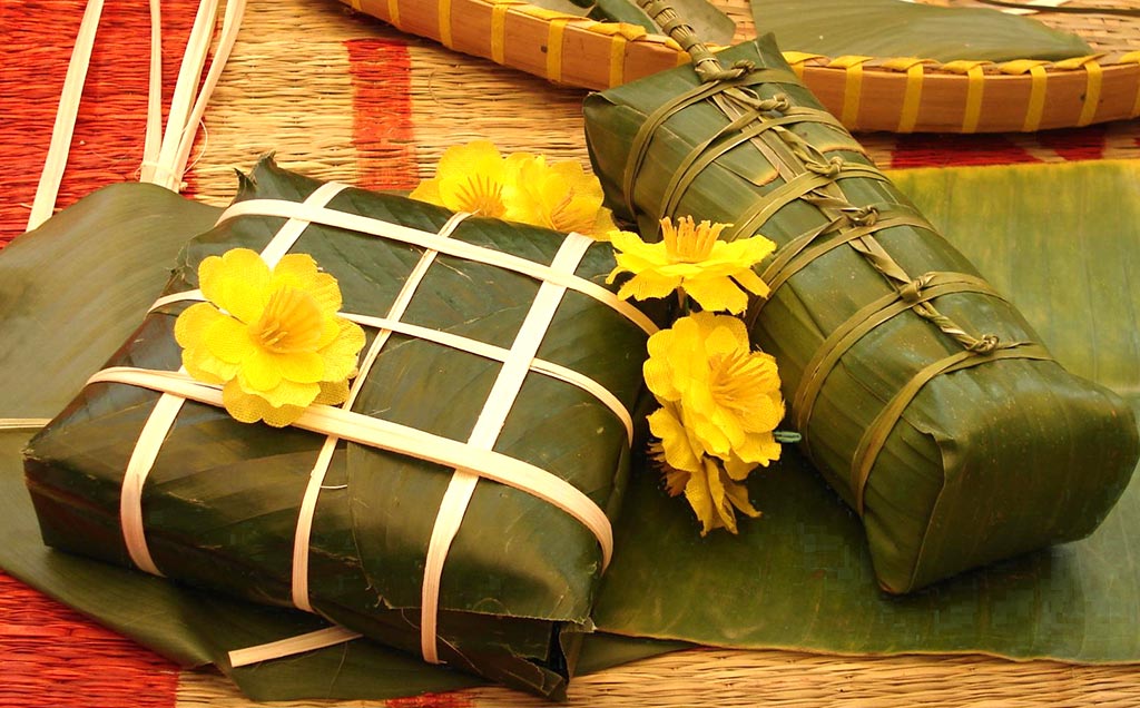 Traditionnellement, à quelques jours du Têt, les Vietnamiens commencent à confectionner le banh chung. Tout d’abord, on trempe séparément le riz gluant et les haricots mungos pendant quelques heures dans l’eau. En attendant, on découpe des morceaux de viande de porc qu’on assaisonne avec du nuoc mam (sauce de poisson) et du poivre. On confectionne le gâteau en étalant des feuilles de phrynium, dans lesquelles on verse dans l’ordre: le riz, les haricots mungos, le porc, puis encore une fois les haricots mungos, et le riz. Ensuite, on plie les feuilles pour former un carré et on attache le tout avec des ficelles de bambou. Le banh chung est cuit pendant une nuit dans l’eau et se conserve généralement une semaine en dehors du frigidaire.