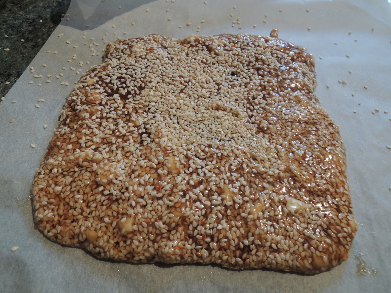 Laissez refroidir puis placez 20 minutes au frigo. Une fois le nougat refroidi, démoulez-le et commencez à le découper en petits cubes. Passez les cubes dans le sésame restant afin de bien les enrober.