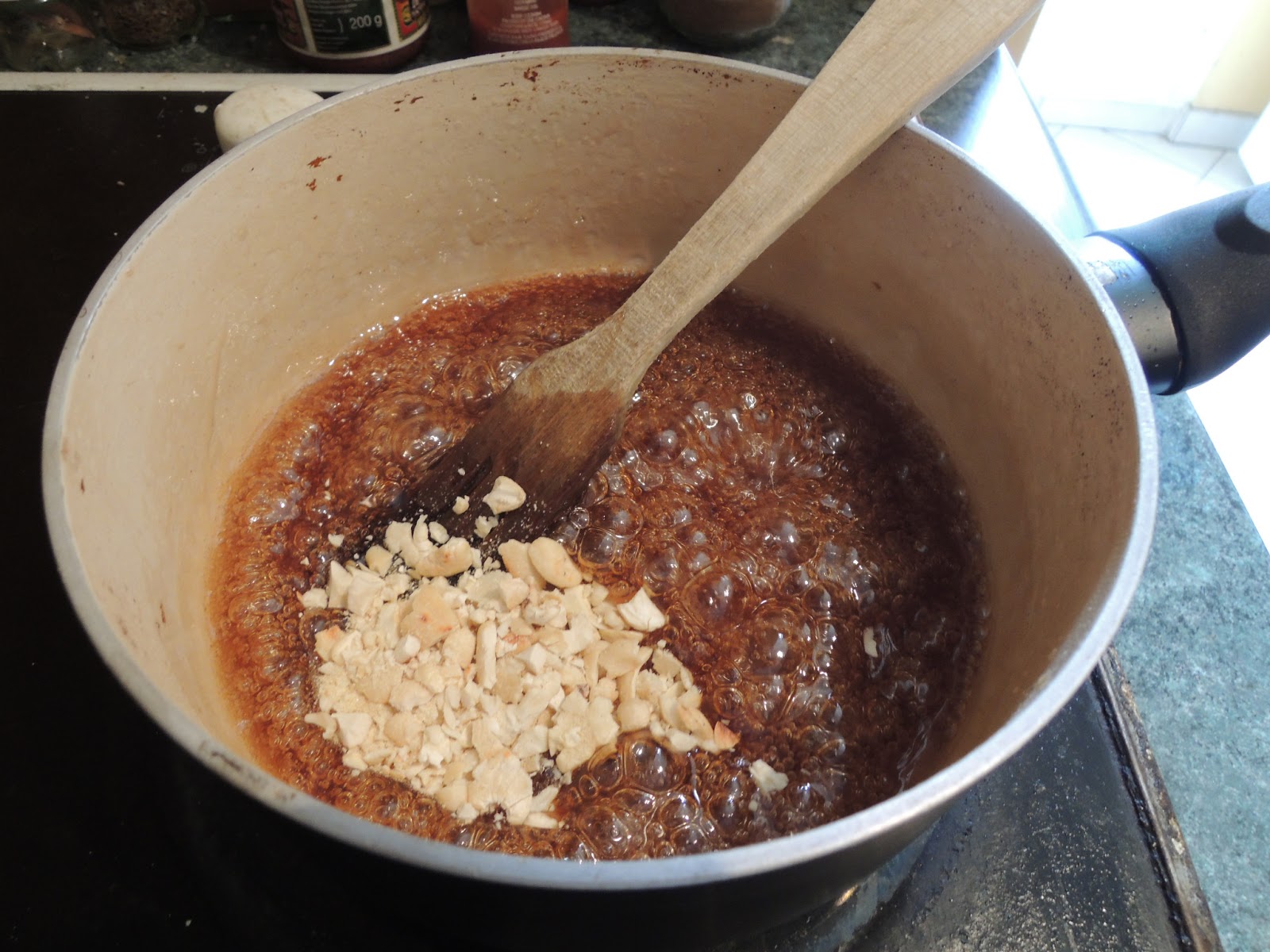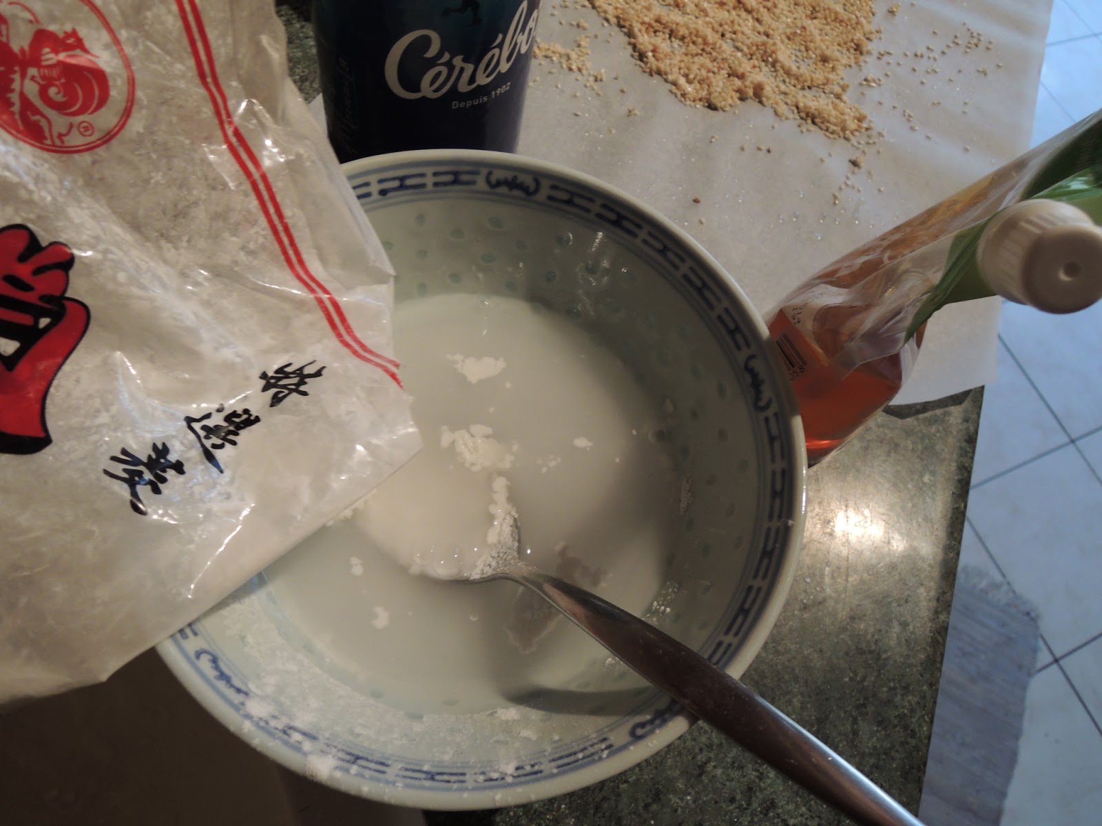Mettez la farine de tapioca avec le reste de l’eau. Versez la en filet dans la casserole tout en remuant. Mélangez sans arrêt jusqu’à ce que la texture s’épaississe et devienne translucide. Vous devriez éprouver une petite difficulté à mélanger par rapport au début.