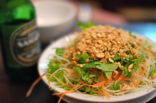Un ami japonais, Monsieur Masahiko Hama, nous a demandé de parler de la salade de papaye verte, un plat typiquement vietnamien. Cher Monsieur Masahiko Hama, il y a mille et une façons de préparer cette fameuse salade, car chaque famille, chaque région a sa propre version. Aujourd’hui, je voudrais vous en présenter deux, une sans doute assez basique et l’autre un peu plus sophistiquée.