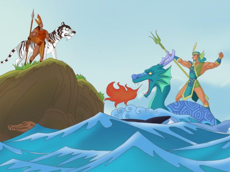 Embarrassé, le roi ne sut lequel choisir car tous les deux avaient des pouvoirs extraordinaires. Finalement, il décida d’accorder la main de sa fille à celui qui serait capable, le premier, de lui rapporter des présents de mariage aussi rares qu’un éléphant à neuf défenses, un coq à neuf ergots, un cheval à neuf crinières rouges. Le lendemain, dès l’aube, Son Tinh se présenta avec tous les présents. Le roi fut ravi et lui accorda la main de Mi Nuong. Quand Thuy Tinh se présenta à son tour, Mi Nuong était déjà partie avec Son Tinh. Furieux, Thuy Tinh se mit à pourchasser le couple avec son armée. Il fit monter le niveau des eaux afin de noyer Son Tinh, mais ce dernier fit pousser les montagnes pour que les eaux ne les atteignent pas.