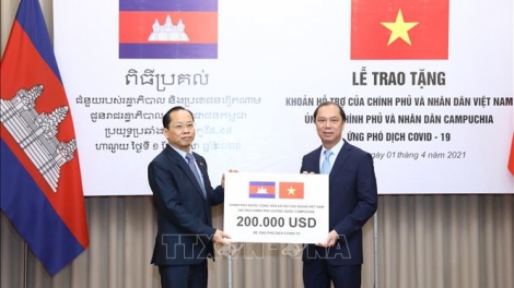 (VOVWORLD) - Le vice-ministre des Affaires étrangères Nguyên Quôc Dung a remis symboliquement le 1er avril à l’ambassadeur du Cambodge au Vietnam Chay Navuth une somme de 200.000 dollars, pour aider notre voisin du sud-ouest dans sa lutte anti-Covid-19.
