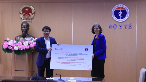 (VOVWORLD) - Le 11 novembre à Hanoi, l’ambassadrice du Canada au Vietnam, Deborah Paul, a remis au vice-ministre vietnamien de la Santé Truong Quôc Cuong des équipements médicaux de protection individuelle d’une valeur totale de plus de 630.000 de dollars.
