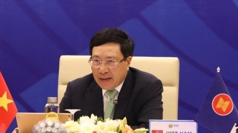(VOVWORLD) - Représentant la présidence de l’ASEAN 2020, le vice-Premier ministre et ministre des Affaires étrangères du Vietnam Pham Binh Minh a présidé en ligne ce lundi la conférence des officiels de haut rang de l’ASEAN et la conférence du Comité du traité sur la zone exempte d’armes nucléaires de l’Asie du Sud-Est (SEANWFZ).