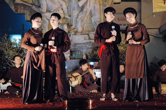 Depuis 2015, le groupe Đông Kinh cổ nhạc collabore avec le comité de gestion de l’ancien quartier de Hanoï pour organiser, tous les mois, un programme intitulé «Histoire musicale de l’ancien quartier». Plusieurs artistes de renom participent comme les chanteurs artistes du peuple Xuan Hoach, Thanh Hoai ou le musicien Dang Cong Hung. Le répertoire est traditionnel, évidemment, mais la façon des artistes de se produire aussi. Assis sur des nattes de souchet, ils jouent de la musique et chantent sans micro ni amplificateur. Dang Xuan Khue, un amateur de musique traditionnel: «Leurs chants me vont droit au cœur. Seuls les vrais artistes du peuple sont capables de provoquer pareilles émotions!»